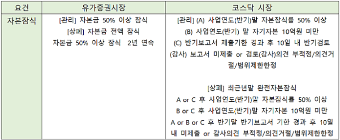 ์๋ณธ๊ธ์ด 1000์ต์ธ ํ์ฌ์ ์๋ณธ์ด๊ณ๊ฐ 500์ต์ด๋ผ๋ฉด, ํ์ฌ ์ด ํ์ฌ์ ์๋ณธ์ ์๋ฅ ์ 50%์ด๋ค. ์ ์๋ฅ ์ด 50%์ด์์ด๋ฉด,(์๋ณธ์ด๊ณ๊ฐ ์๋ณธ๊ธ์ ์ ๋ฐ์ด ๋์ง์์ผ๋ฉด,) ๊ด๋ฆฌ์ข ๋ชฉ์ด ๋๊ณ ๋์๊ฐ ์์ฅํ์ง์ ์ฌ์ ๊ฐ ๋๋ค.