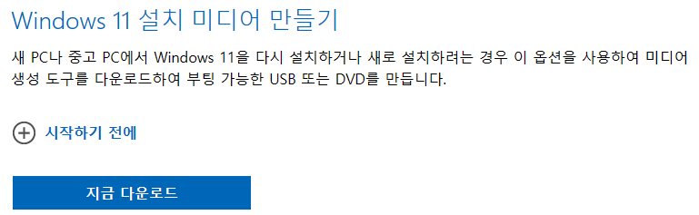 새 PC나 사용중이던 PC에서 윈도우11을 다시 설치하거나 새로 설치하려는 경우 이 옵션을 사용하여 미디어 생성 도구를 다운로드하여 부팅 가능한 USB 또는 DVD를 만듭니다.