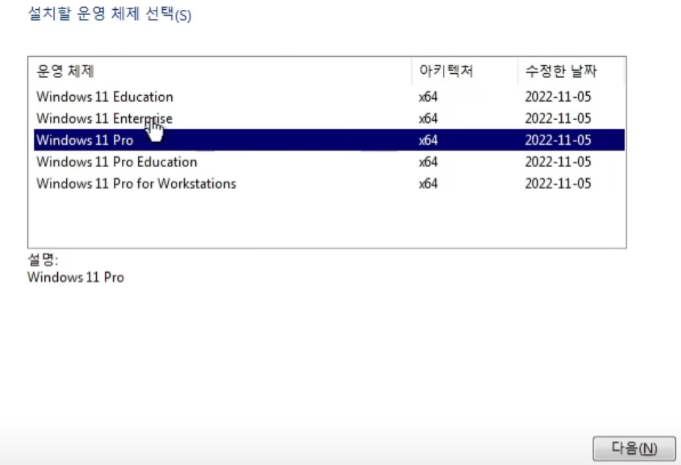 구매한 윈도우 버전을 선택하고 다음을 클릭한다.