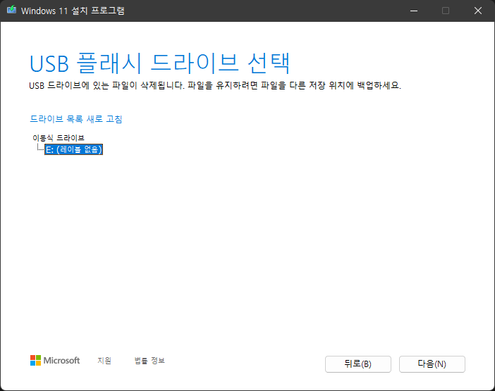 저장 될 USB를 선택한다. USB를 하나만 꼳혀 있다면 위와 같이 하나만 뜬다. 여러개일 경우 저장될 USB를 선택해야 한다. 다른 저장매체 선택하면 안된다. 사용되는 USB의 저장 데이터는 모두 삭제된다.
