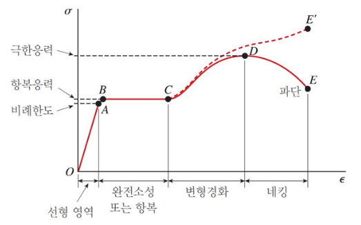 - D-E: κ·Ήνμλ ₯μ λμ΄μλ©΄ μ¬λ£μ λ¨λ©΄μ μ΄ μ€μ΄λλ λ€νΉ(Necking) νμμ΄ λ°μν©λλ€. μ΄λ‘ μΈν΄ μ¬λ£μ κ°λλ κ°μνκ³ , κ²°κ΅ νλ¨(Breaking Point)μ μ΄λ₯΄κ² λ©λλ€. μ΄ μ§μ μμ μ¬λ£λ νκ΄΄λ©λλ€.
