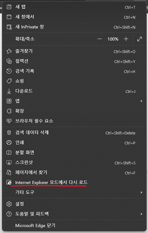 - … (점 세 개 아이콘) 클릭 → Internet Explorer 모드에서 다시 로드(Reload in Internet Explorer mode) 선택