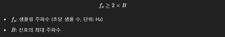 “์ต๋ ์ฃผํ์ B[Hz]๋ฅผ ๊ฐ์ง๋ ์๋ ๋ก๊ทธ ์ ํธ๋, ์ต์ 2B[Hz] ์ด์์ ์ฃผํ์๋ก ์ํ๋งํด์ผ ์์ค ์์ด ๋ณต์ํ ์ ์๋ค.”