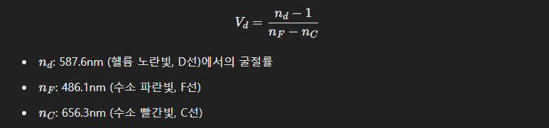 ๊ฐ์ฅ ์ผ๋ฐ์ ์ธ ๊ณ์ฐ ๋ฐฉ๋ฒ์ ์๋ฒ ์(Abbe number, Vd)๋ผ๋ ๊ฐ๋ ์ ์ฐ๋ฉฐ, ๋ถ์ฐ๋๋ ์๋ฒ ์์ ์ญ์์ ๋น๋กํฉ๋๋ค.