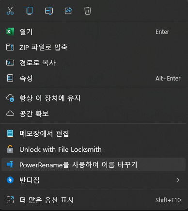 - ์ ํํ ์ํ์์ ๋ง์ฐ์ค ์ค๋ฅธ์ชฝ ๋ฒํผ ํด๋ฆญ → PowerRename์ ์ ํํ์ธ์.